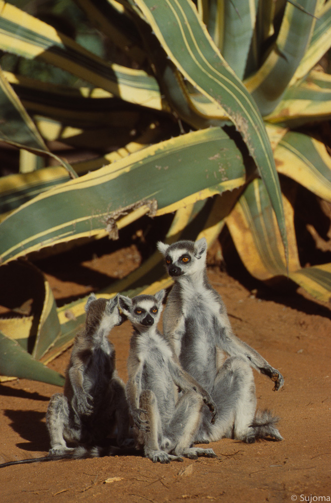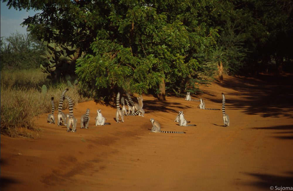 Eine Gruppe Kattas kreuzt den Weg. Die Populationen der Kattas im Berenty Naturreservat lebt seit längerer Zeit isolierte. Man sieht es ihnen an.